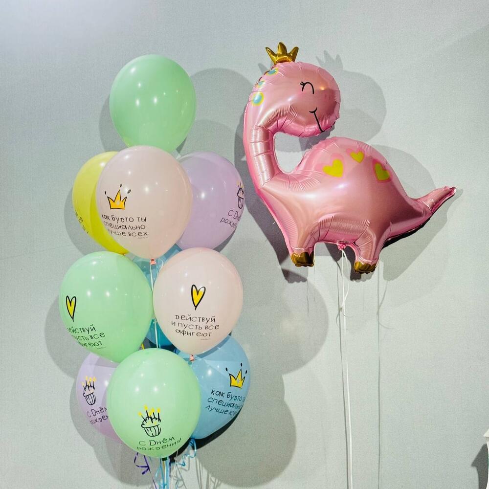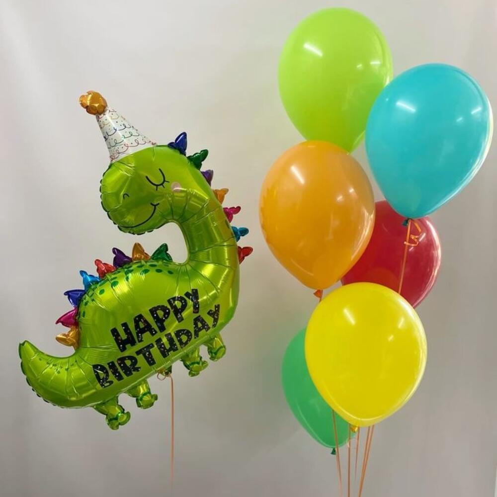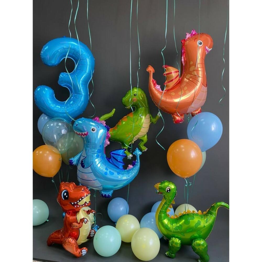 - 7 латексных шаров (30 см) — создадут гармонию в оформлении; - 5 фольг. фигурок динозавров - как яркие акценты. - Фольгированная цифра 40" (104 см) - подчеркнут важность вашей даты.