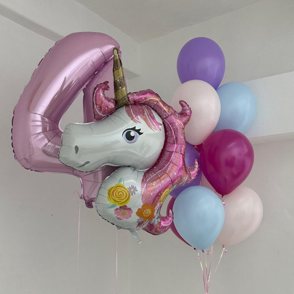 - 10 латексных шаров (30 см) - создадут радостное настроение и добавят веселья вашему мероприятию. - Фольгированная цифра (104 см): - подчеркнет важность вашей даты; - Фольгированный шар "Единорог" - отлично подойдет для маленьких принцесс!
